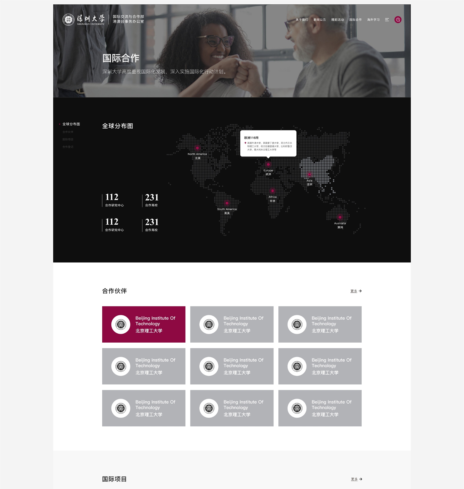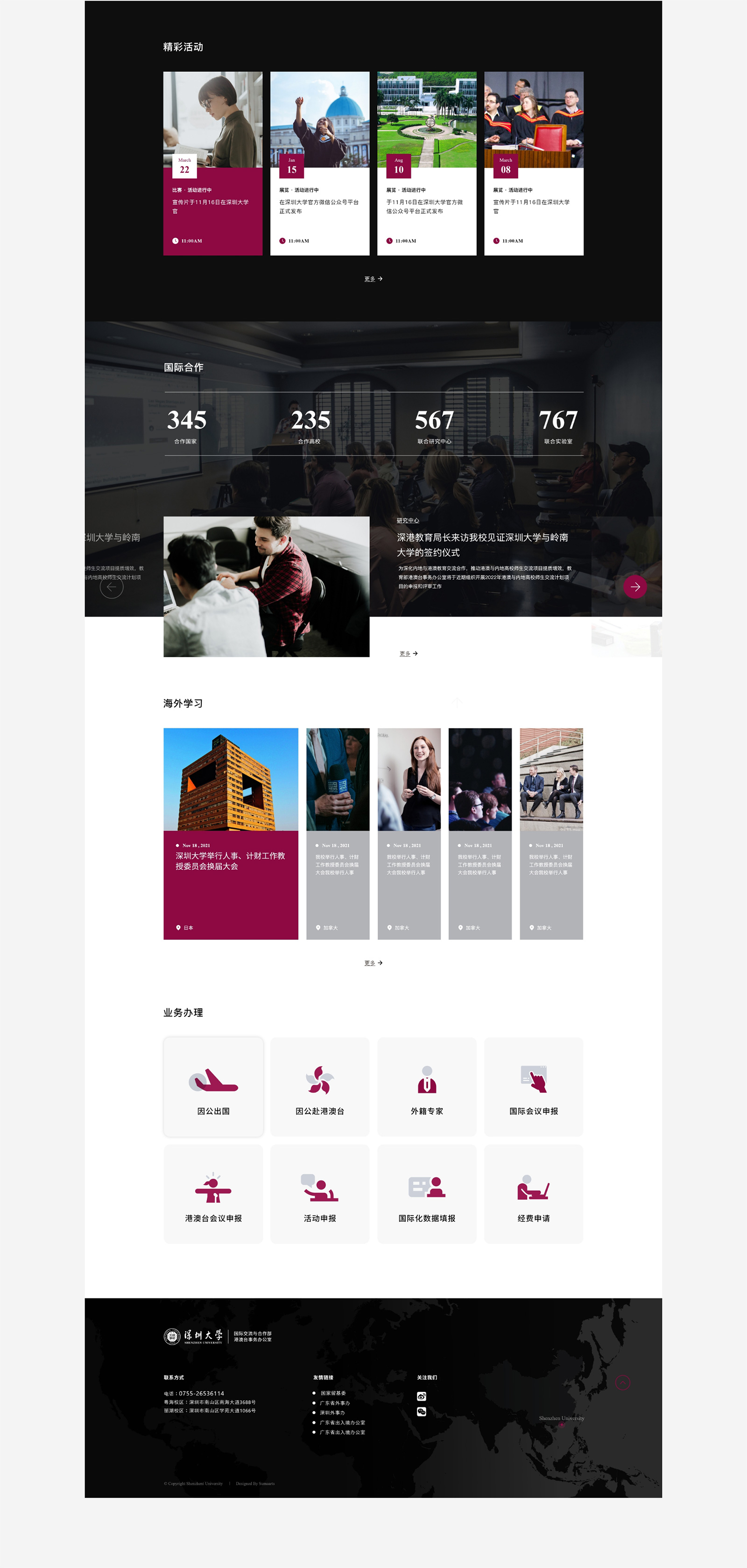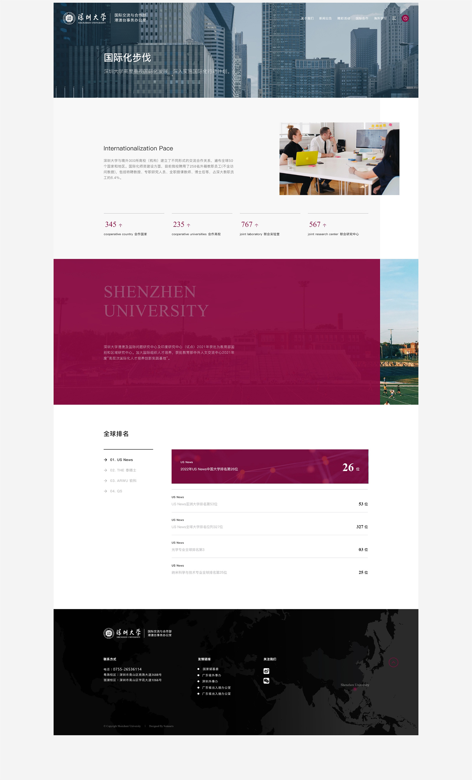 深圳大学与境外300所高校(机构)建立了不同形式的交流合作关系,遍布全球50个国家和地区。国际化师资建设方面,目前我校聘用了258名外籍教职员工(不含访问教授),包括特聘教授、专职研究人员、全职授课教师、博士后等,占深大教职员工的6.4%。